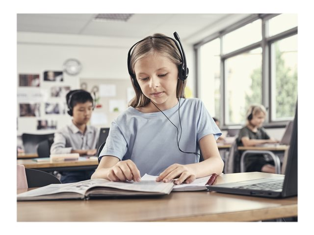 Le casque stéréo EDU 12 USB offre aux élèves un contrôle supplémentaire et les aide à rester concentrés. Les commandes intégrées permettent aux élèves de régler le volume et de couper le son facilement sur l'appareil, tandis qu'un micro antibruit élimine les bruits de fond. Vendu par lot de 10 casques.